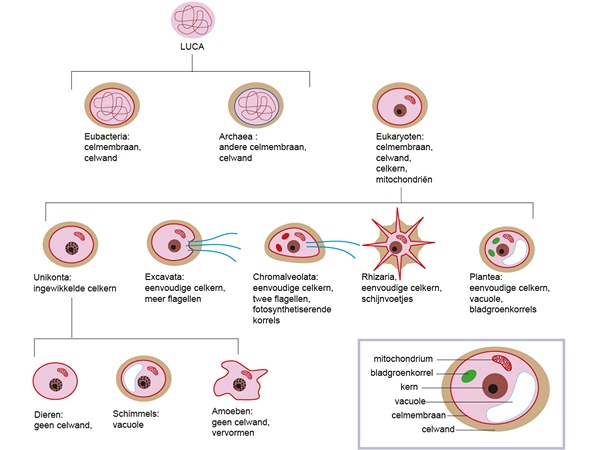 In de vorige eeuw werd de levende wereld ingedeeld in drie domeinen: de bacteriën, de archaea en de eukaryoten. De eukaryoten hebben een celkern, mitochondriën en kunnen meercellig zijn.
